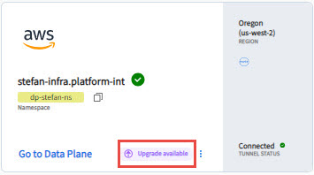 On the data plane card, click Upgrade available. Alternatively, on the data plane details page, you can see Upgrade available pop-up and button in the top pane.