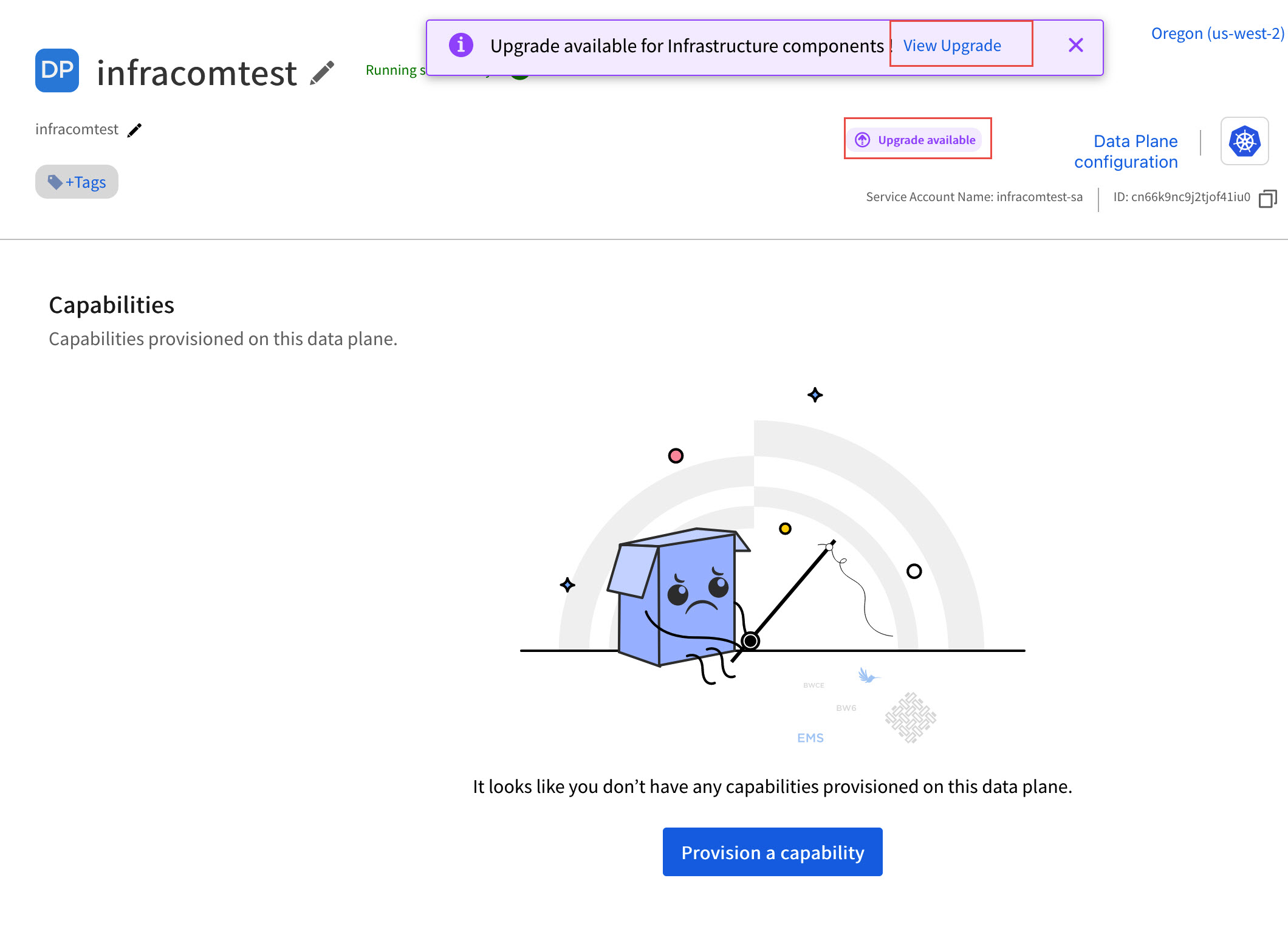 When a new version of infrastructure components is available, you can see the Upgrade available message on the data plane card. You must do the upgrade to use the latest features. It is a best practice to have infrastructure components on the latest version to ensure that all capabilities and services are running without any issues.