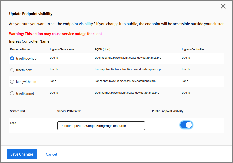 Click Set Endpoint Visibility to change from Private to Public or vice versa. Select the Ingress Controller Name option that you want to change.