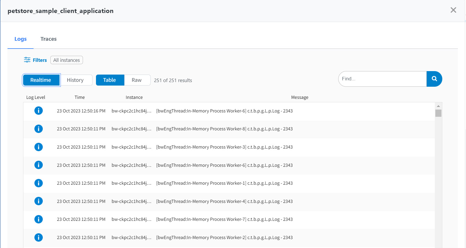 The Logs tab displays both Real-time logs and historical logs. Real-time logs are refreshed every 10 seconds. In historical logs, logs for last 5 minutes are displayed. Log level (Info, Debug, Warning, Error) is displayed in the first column. You can switch between Table view and Raw view. You can search through log entries using the search box.