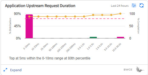 Application upstream request duration is the time required to complete the request by an application. The Application Upstream Request Duration Summary card applies to inbound HTTP requests successfully processed by BWCE and Flogo applications.