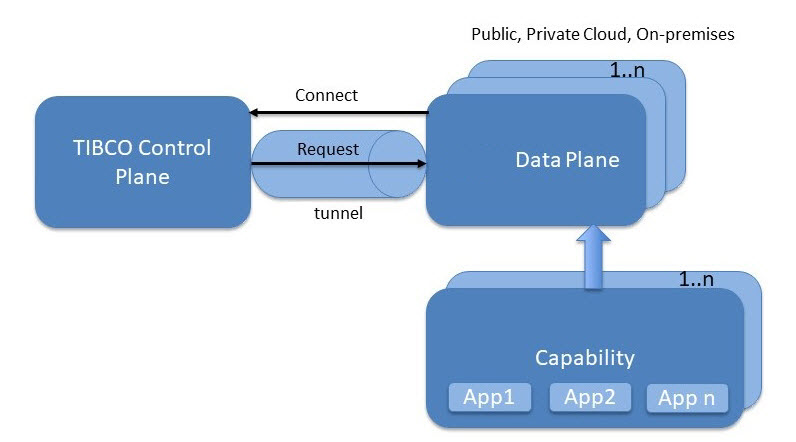 Data plane is a logical group of TIBCO capabilities, applications, and third-party supporting tools running on any public cloud, private cloud, or on-premises infrastructure. Consider a data plane as your Kubernetes cluster consisting of one or more namespaces. The specified Kubernetes cluster can have one or many data planes and each of these data planes correspond to one or many namespaces. Once you register a data plane on TIBCO Control Plane, Control Plane can communicate with data plane through tunnel. You can provision one or more capabilities on a data plane. After you have provisioned capability on a data plane, you can deploy and manage your apps on data plane. You can also register your bare-metal TIBCO products as a data plane and monitor it by using TIBCO Control Plane.