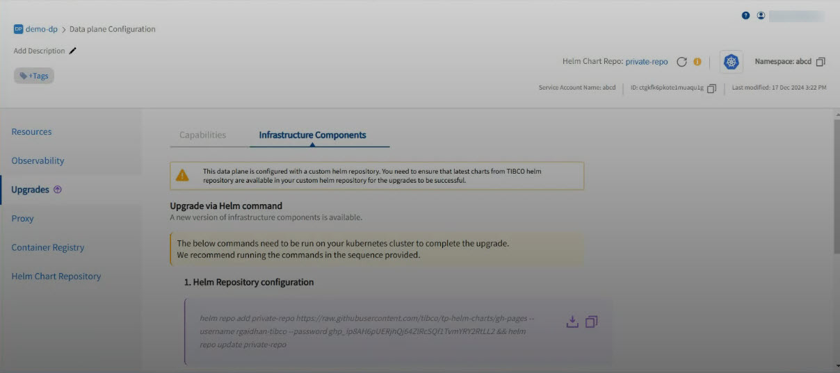 dp-configure-namespaceis available for upgrade then helm command fordp-configure-namespaceis only displayed, ifdp-core-infrastructureis available for upgrade then helm upgrade command for it is displayed and if both are available for upgrade then both the commands are displayed. You must havedp-core-infrastructurechart version 1.1.8 or later to view both commands.