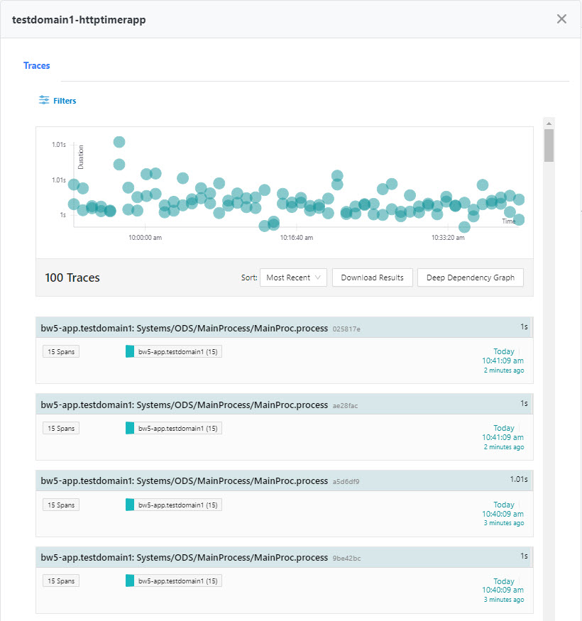 The Traces tab displays the traces for an application. A trace represents a complete execution made up of single or multiple spans. By default the graph displays 100 traces and traces data for the last hour. Click a trace on the graph to view trace details.