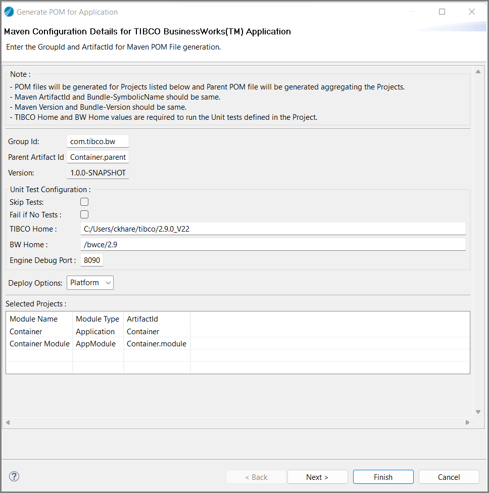 .applicationfile and select Generate POM for Application. - From the Generate POM for Application window, select Platform as Deploy Options and click Next.