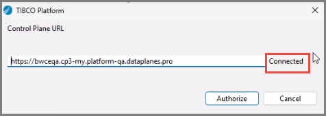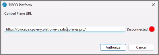 icon on the toolbar to connect to the control plane. - Once the TIBCO Platform window opens, add the control plane URL.