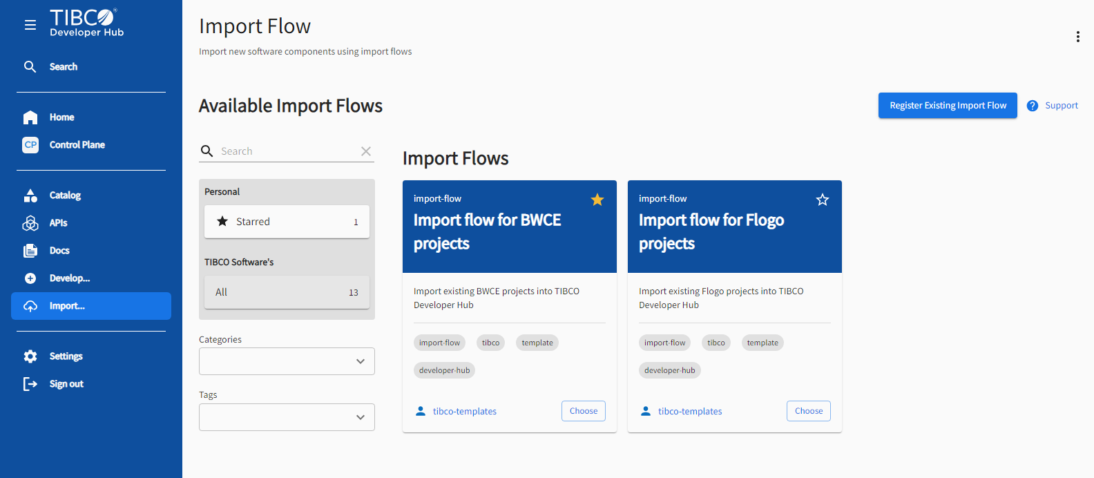 Import flows are the same as templates with the tags: import-flow. You can import new entities like components, templates, APIs, and more, in TIBCO Developer Hub using import flows.