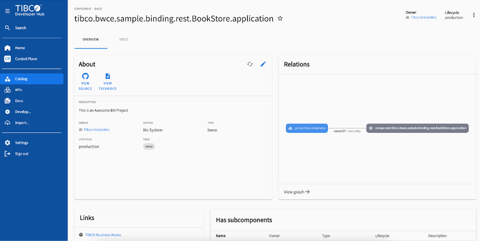 - After completing the import flow run, your (BusinessWorks Container Edition) component gets registered in the catalog. Click Open in catalog to see the registered component. To view the created pull request in the current repository, click Repository (Pull Request).