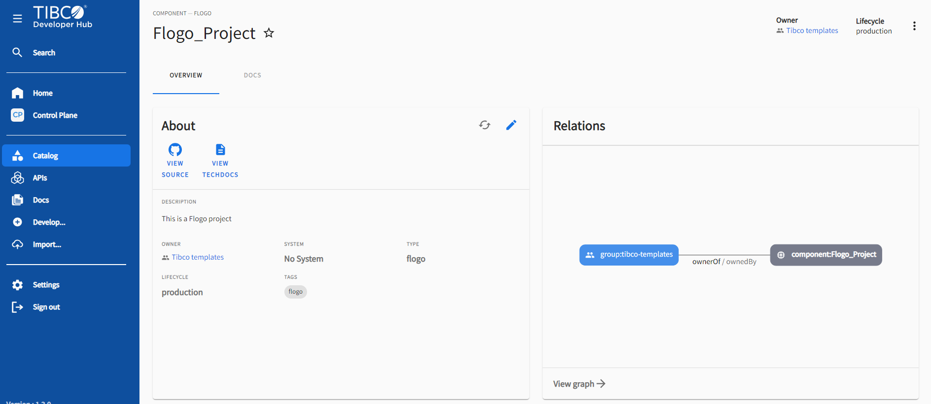 - After completing the import flow run, your (Flogo) component gets registered in the catalog. Click Open in catalog to see the registered component. To view the created pull request in the current repository, click Repository (Pull Request).