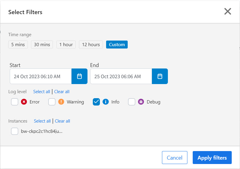 To filter the log data, click Filters. You can filter the data by using time range, custom date and time range, Log level, and application instances.