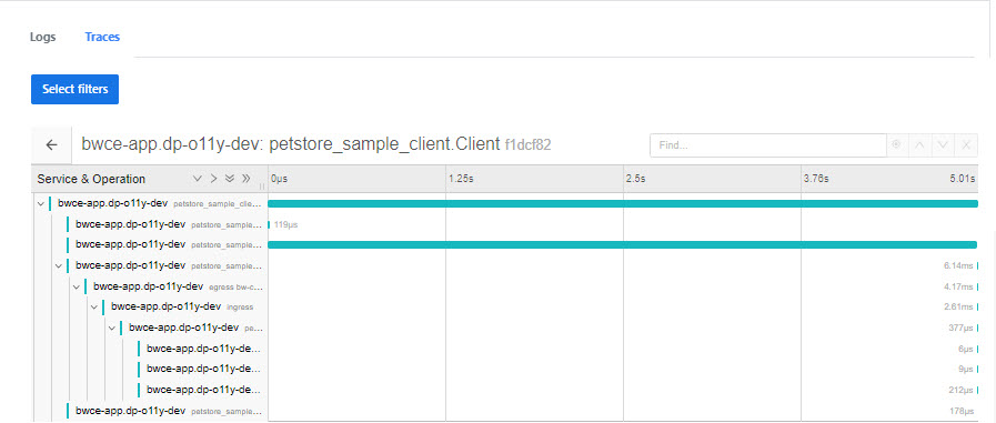 On the application details page, click Logs and Traces tabs to view the Logs and Traces data for an application.