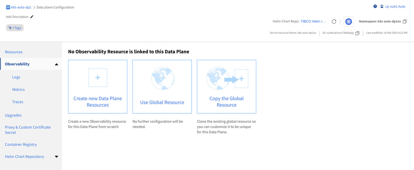 - To create a separate observability resource at the data plane level with the same global resource configuration, click Copy the Global Resource.