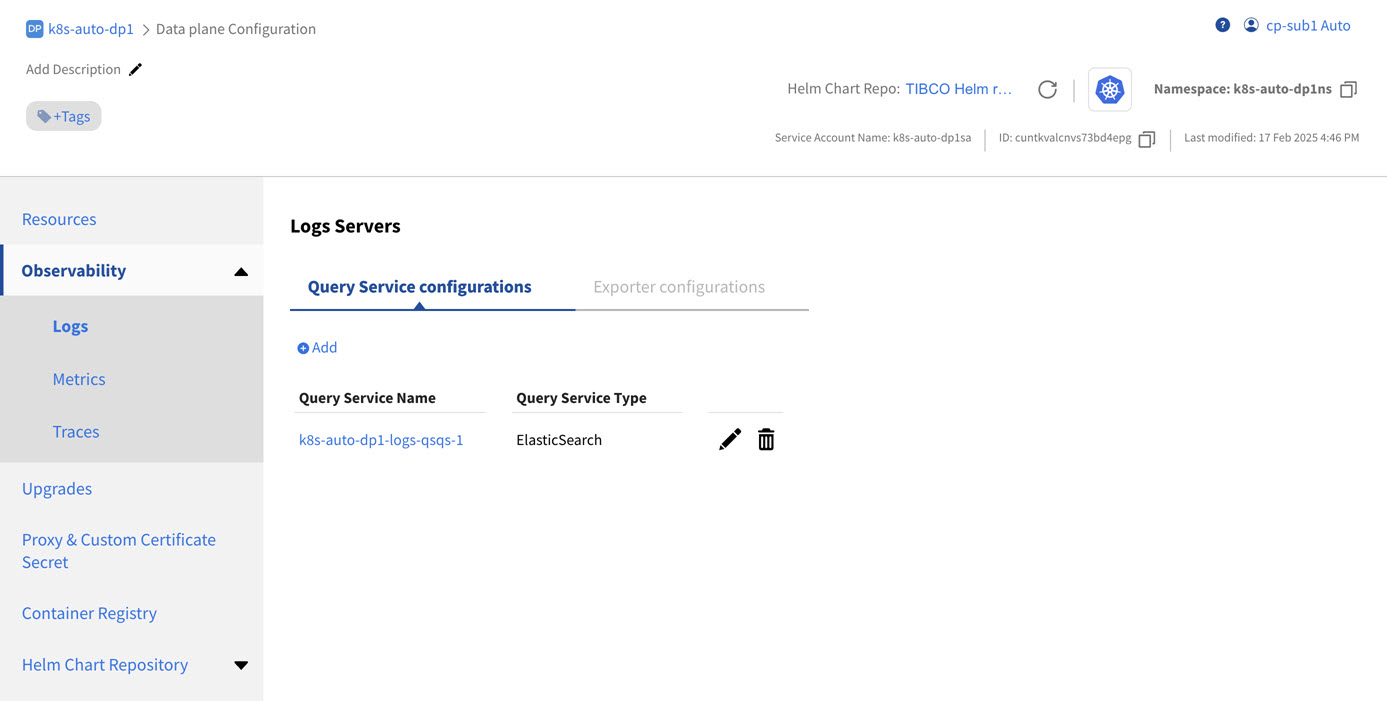 The listings of the Query Services and Exporters under the sub tabs of Logs, Metrics and Traces servers display only those that are created for this data plane. You cannot view the Query Services and Exporters that are created in the Global Observability resource configuration.