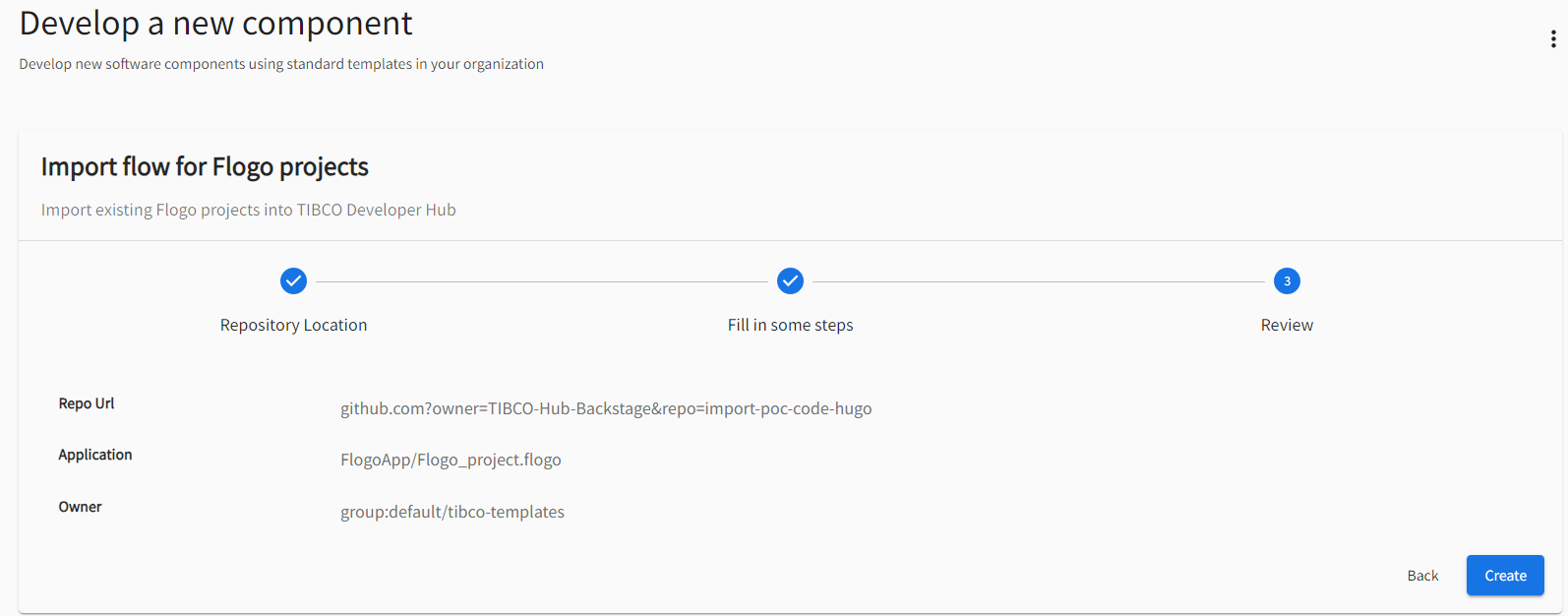If you provision the TIBCO Developer Hub without adding catalog location config, then you get the following three Import Flows by default. You can use these registered import flow to import a new software component.