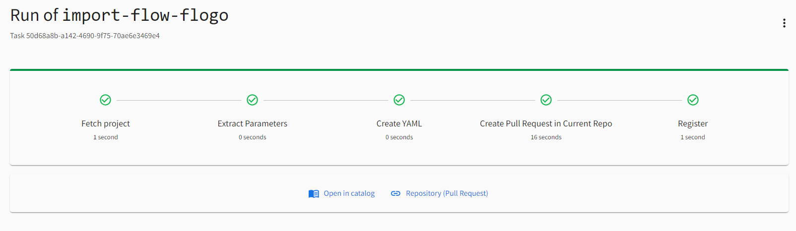 - After completing the import flow run, your (Flogo) component gets registered in the catalog. Click Open in catalog to see the registered component. To view the created pull request in the current repository, click Repository (Pull Request).