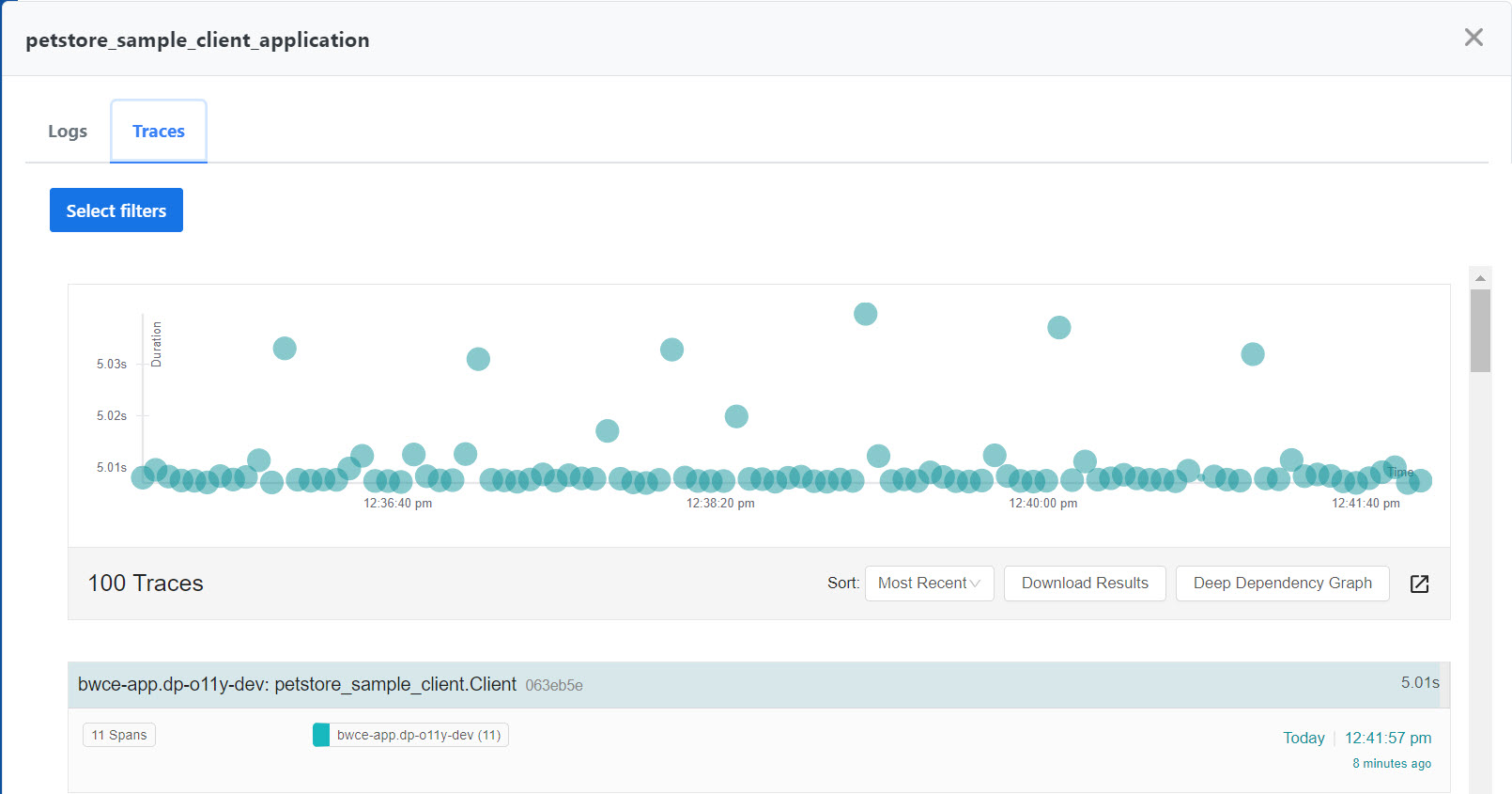 The Traces tab displays the traces for an application. A trace represents a complete execution made up of single or multiple spans. By default the graph displays 100 traces and traces data for the last hour. Click a trace on the graph to view trace details.
