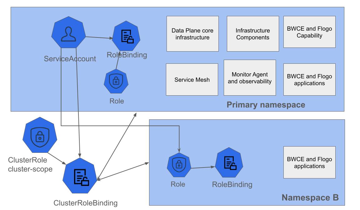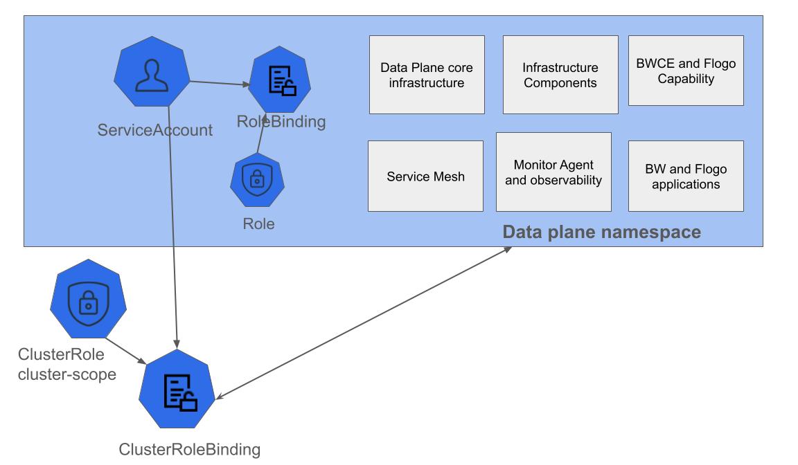 By default, service account has cluster-scope permissions. If you do not want to give cluster-scope permissions to service account, you can disable cluster-scope permissions when registering a data plane from TIBCO Control Plane UI. If you disable cluster-scoped permissions, cluster-scoped role-bindings are not created. It creates namespace-scoped Role and RoleBindings in the namespace where the dp-configure-namespace chart is deployed.