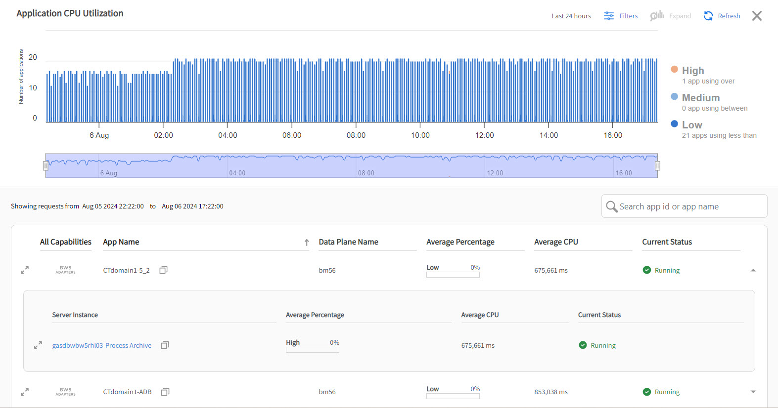 Application CPU Utilization details page provides a graphical view to analyze average CPU utilization by an application over the time period. The time graph gives an observability of the number of apps that are under CPU load recorded in the target time window. Using the time range slider, you can narrow down to the exact participating apps in the app list to do further analysis of the cause of the high CPU load.