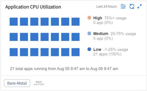 Application CPU Utilization card displays the average percentage CPU usage distribution of the number of unique TIBCO ActiveMatrix BusinessWorks 5.x applications running in the selected time range. The percentage is the ratio of the amount of CPU utilization consumed by the application and the total available CPU capacity.