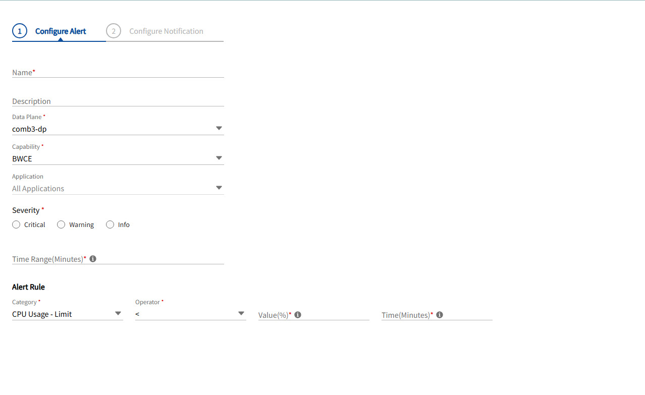 Field Description Name Name of the alert Description Provide some description of the alert Data Plane Data plane for which the alert is applicable Capability Capability for which alert is applicable Applications By default, alert is applied on all the applications of that particular capability provisioned in the data plane.