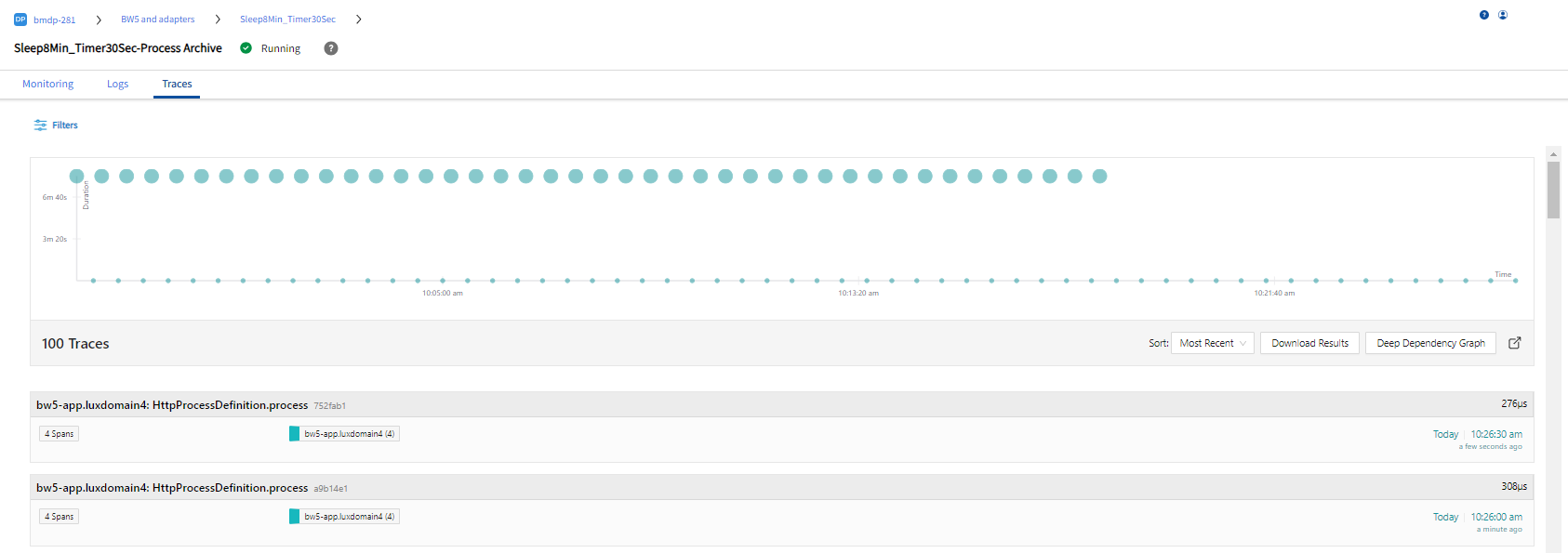 On the Traces tab, click Filters , and select the Time range and Limit. By default the graph displays 100 traces and traces data for the last hour. Click Apply Filters.
