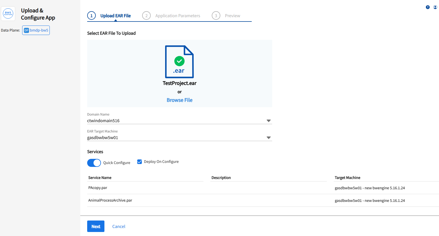 The following tabs are available: Upload EAR File, Application Parameters, and Preview.