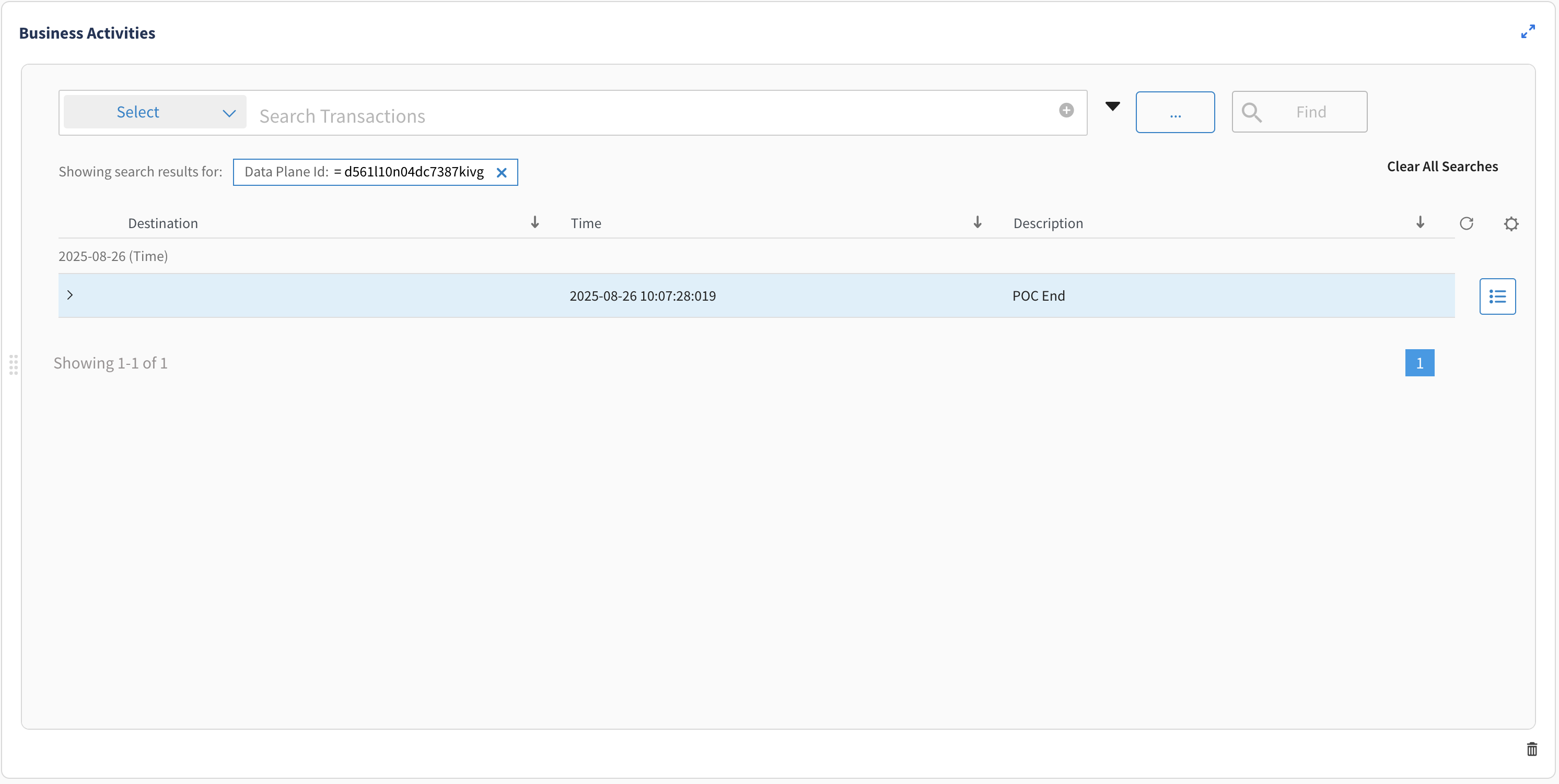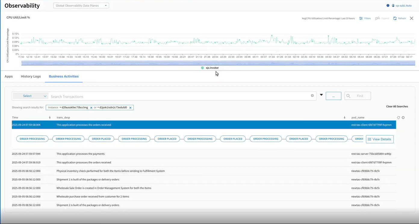 The Business Activities card provides enhanced capabilities for tracing and monitoring business processes across multiple applications. This enables you to gain visibility into complex business activities, such as "purchase order processing," by tracing their flow across different applications within your environment. Business Process describes the chain of successive and chronological events that need to be recorded. For example: an Order process, a Trade process, a Claim process, an Invoicing process, a Payment process, and so on. This functionality is enabled through a TIBCO Flogo® Connector for TIBCO® AuditSafe.