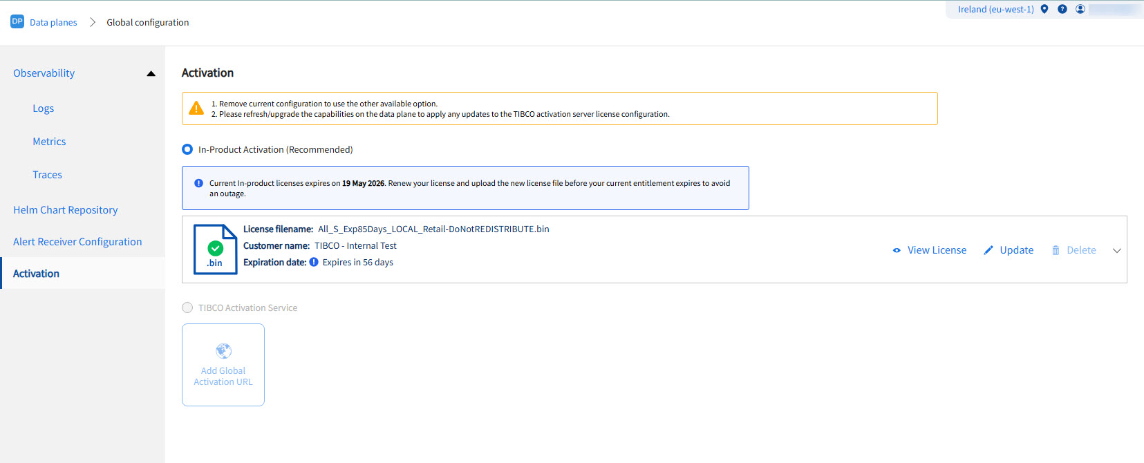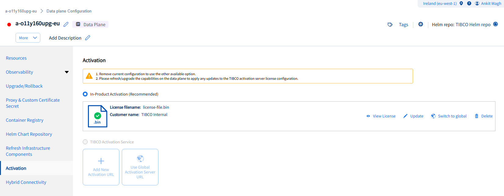 TIBCO Activation Service (remote activation): You can add activation URL, edit or delete the existing URL. If you do not want to configure Activation URL at the data plane level, you can use Activation URL configured in the global configuration and can unlink when required. You can also use activation URL configured at the Global level by clicking Switch to Global link.