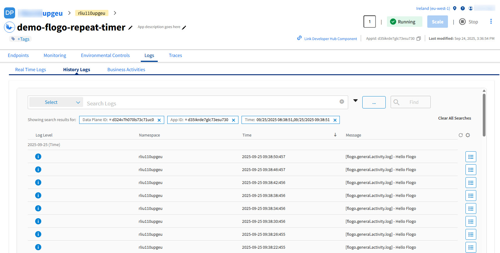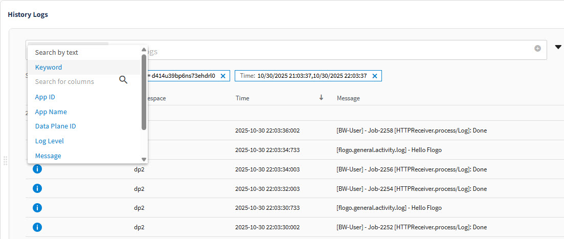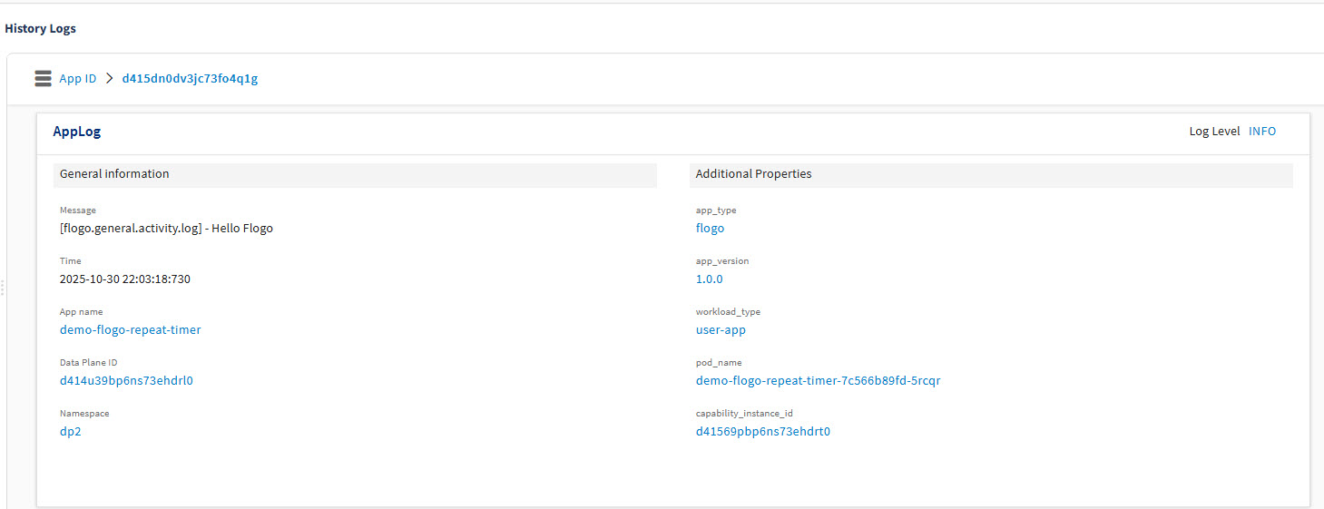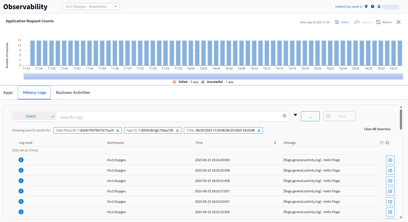 On the application details page, click History Logs tab to view the Logs data for an application.