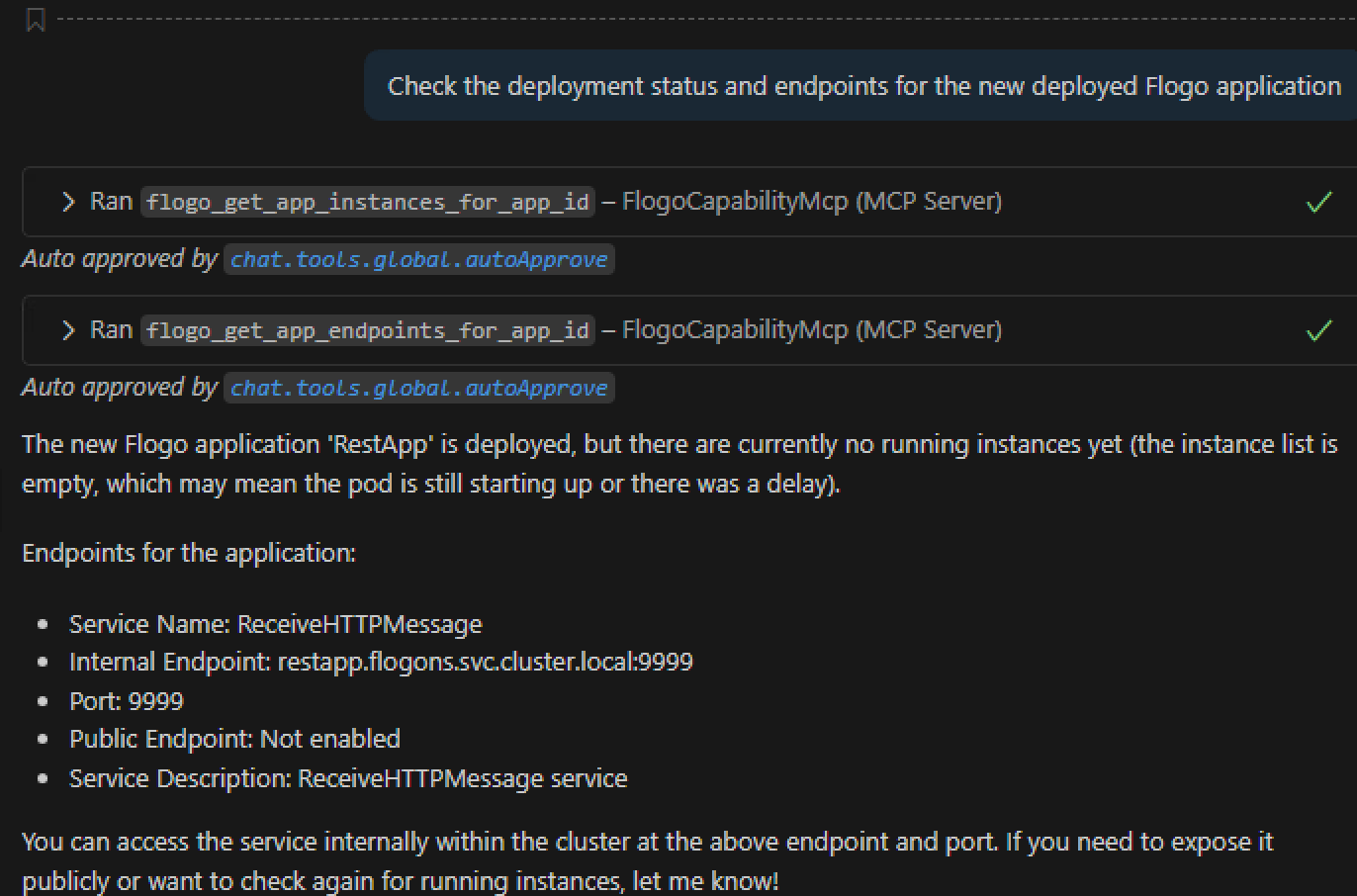 Check the deployment status and endpoints for the new deployed Flogo application