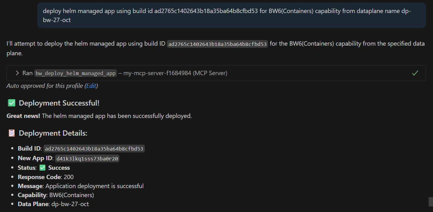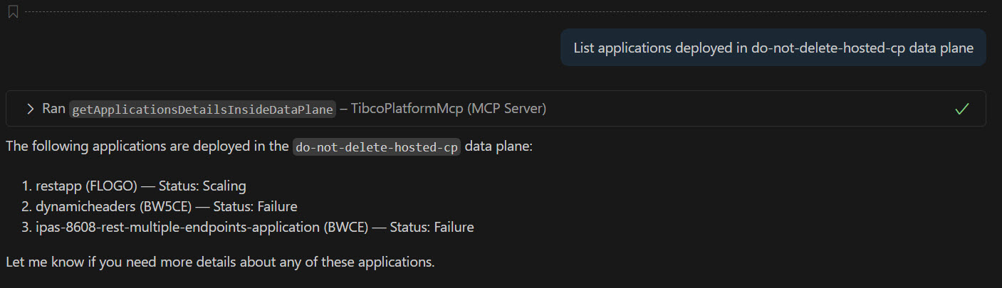 You can configure AI applications (such as VS Code) to communicate with this server. When you provide a relevant prompt, your application calls the TIBCO Control Plane MCP server to perform supported actions.