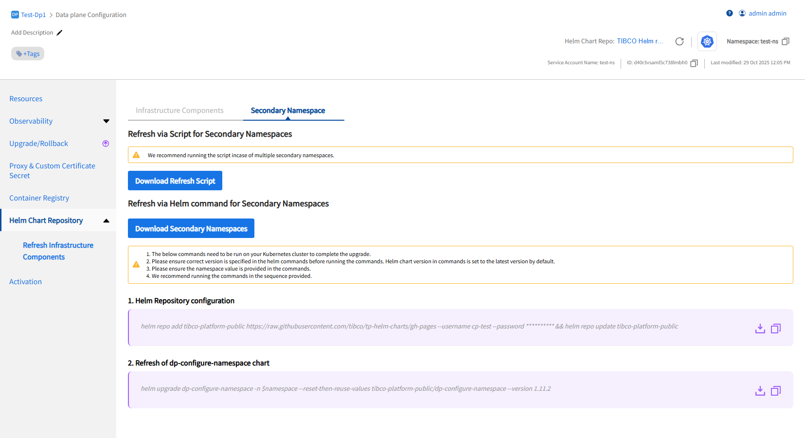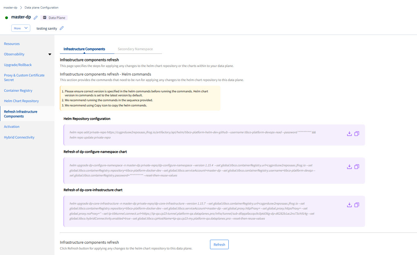 On the Infrastructure components refresh page, click the Secondary Namespace tab. Commands to refresh are displayed.