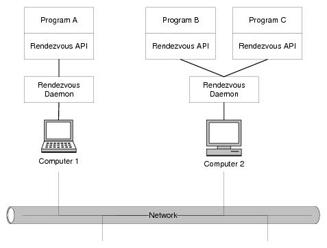 Figure 1 illustrates the interaction of these two parts in the operating environment. Computer 1 runs program A and a daemon process. Computer 2 runs two programs, B and C, which connect to the network using a single Rendezvous daemon process. All three programs can communicate with one another.