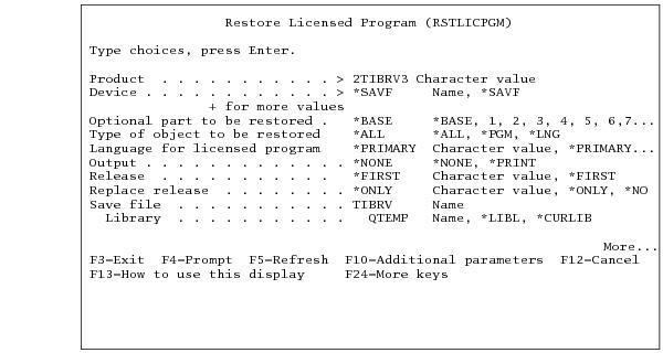 5. Install using the command RSTLICPGM as follows:RSTLICPGM LICPGM(2TIBRV3) DEV(*SAVF) SAVF(libname/TIBRV)Figure 1 IBM i: Beginning the Installation