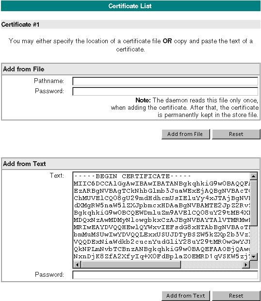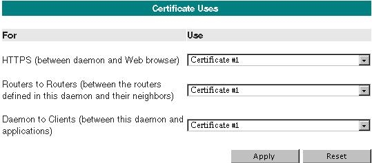 Each daemon process keeps a list of certificates it can use to identify itself. These certificates are numbered for easy reference. The first panel on this page determines which of these certificates the daemon uses for particular tasks. The remainder of the page lets you enter the certificates.