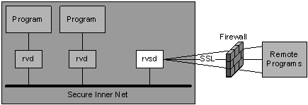 rvsd—Secure Connections across Single Firewall depicts a hub and spoke architecture. An rvsd hub runs on a firewall computer, and remote programs access the hub through secure TLS connections. This arrangement lets trusted remote programs communicate with servers and other programs inside the secure inner network. rvsd bars untrusted programs from connecting to it.