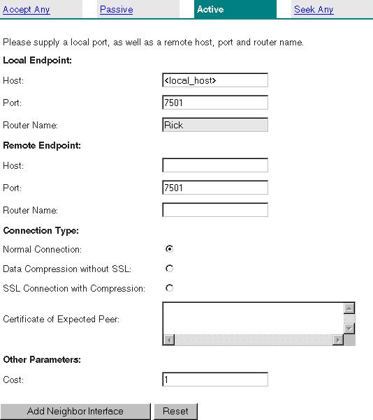 Use this variation of the form to specify a neighbor interface in which the local router actively attempts to connect to the remote neighbor. A distinguishing characteristic of active neighbors is a remote endpoint string in which the router name, the host and the port are all specified. For an example, see Active Neighbor. |