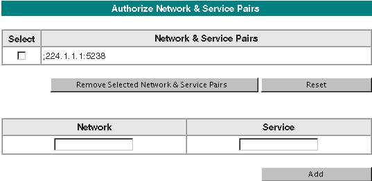 To add access to a network and service pair, type the specifications and click the Add button. |