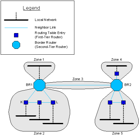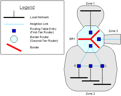 A zone or first-tier routing network is a collection of routers and local networks, in which every pair in the collection is connected by a route that does not cross through a border router.