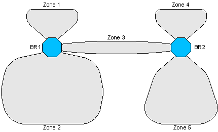 When we say that a border router participates in a zone, we really mean that one of the implicit first-tier routers within the border router participates in that zone. Border Router: Implicit Internal First-Tier Routers expands a portion of Border Router: Concepts; it illustrates that border router BR1 contains three implicit internal first-tier routers, which serve zones 1, 2 and 3. Each one participates in one zone, as a representative of BR1.