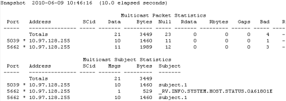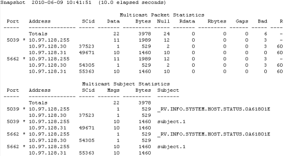 | • | Subject Statistics—recapitulates Rendezvous multicast and broadcast message activity during the interval, featuring information about subject names (see Subject Statistics) |
