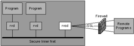 hub runs on a firewall computer, and remote programs access the hub through secure TLS connections. This arrangement lets trusted remote programs communicate with servers and other programs inside the secure inner network. rvsd