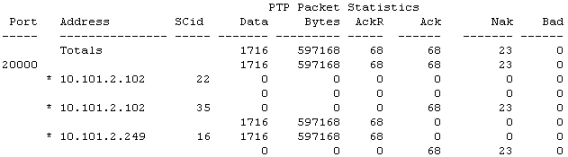 The Nak column shows that SCid 16 at 10.101.2.249 did not receive all the packets correctly, and sent 23 NAKs back to SCid 35 at 10.101.2.102. These NAKs constitute retransmission requests for the missed point-to-point packets. |