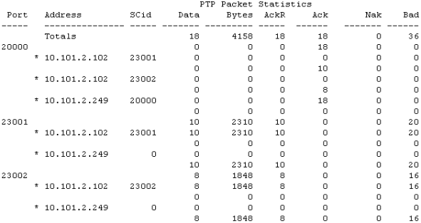 For each IP address with point-to-point data packet activity, this table contains a destination row and a source row—always paired in that order. An * and an IP address (in the Address column) flags a row as a destination row. A blank (space characters) flags a row as a source row. The address in the destination row also applies to the source row that immediately follows it.