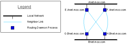 In Fault Tolerance among Routing Daemons, two routing daemon processes, E.Anet.moo.com and F.Anet.moo.com, run on separate host computers, and serve the local client network Anet.moo.com; similarly, routing daemons G.Bnet.moo.com and H.Bnet.moo.com both serve local client network Bnet.moo.com. Neighbor links connect E with G and H, and also F with G and H. Although these neighbor links offer redundant paths from Anet to Bnet, the routing daemons cooperate to forward each message only once. In failure situations, the routing daemons automatically readjust to continue service smoothly.