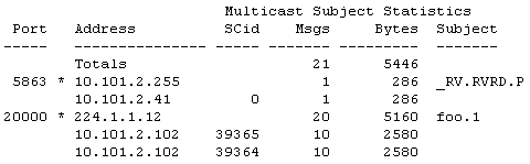 Each destination row is the heading and subtotal for the source rows that follow it. For example, consider the destination row with foo.1 in the Subject column. The Msgs column indicates 20 multicast messages. The two subsequent source rows indicate that those 20 messages came from two sources on the host 10.101.2.102—that is, SCid 39365 sent 10 messages, while 39364 sent another 10 messages. The subtotal 20 in turn contributes to the grand total 21 in the network total row.
