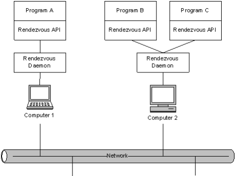 Rendezvous Operating Environment illustrates the interaction of these two parts in the operating environment. Computer 1 runs program A and a daemon process. Computer 2 runs two programs, B and C, which connect to the network using a single Rendezvous daemon process. All three programs can communicate with one another.
