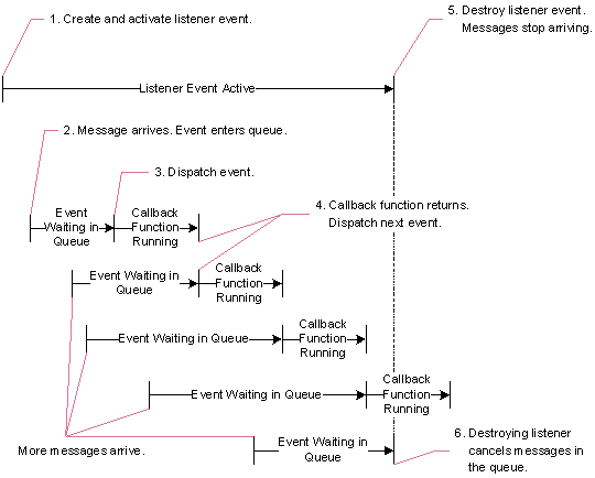 Listener Activation and Dispatch illustrates that messages can continue to accumulate in the queue, even while a handler delegate callback function is processing.
