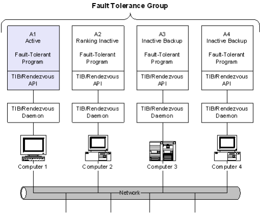 Only one of the four producer processes (A1) actively sends information. The other three are backup processes; they each compute an information stream that is parallel to that of the active process, but they do not send the information. If the active process stops functioning, Rendezvous fault tolerance software directs one of the three backup processes to begin active multicasting in its place. In this way the redundant processes cooperate to provide a fault-tolerant service without flooding the network with redundant information.