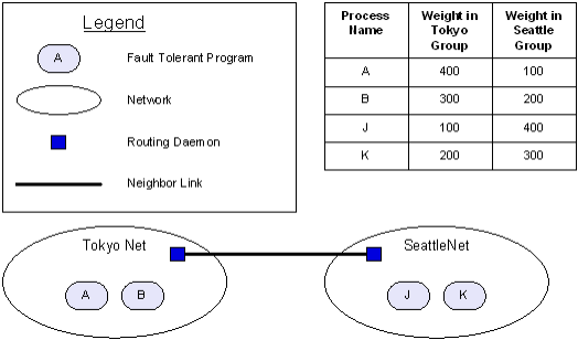 To administer fault tolerance at the Tokyo site, processes A and B join a fault tolerant group named TOKYO.APP1. A has higher weight than B, so A is initially active. The group’s active goal is one, so only one member of the group actively processes requests. Similarly, processes J and K in Seattle join a group named SEATTLE.APP1. J has higher weight than K, so J is initially active.